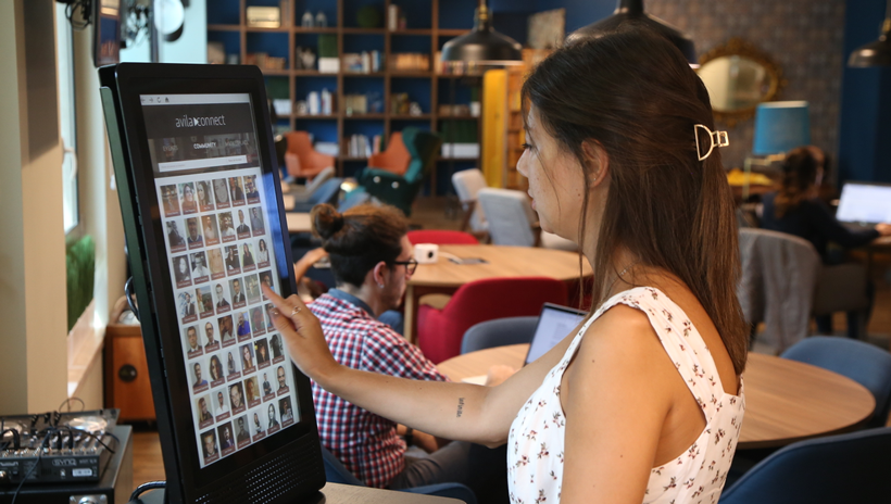 O Quiosque Digital está no business lounge do Avila Spaces e baseia-se num grande ecrã táctil de 22 polegadas com uma interface em formato de mosaico onde aparecem as fotografias de todos os membros do coworking. Entre as principais funcionalidades desta plataforma inovadora do Avila Spaces (que também está associada à app MyOffice) está o acesso ao Marketplace e uma agenda dos eventos de networking do espaço.